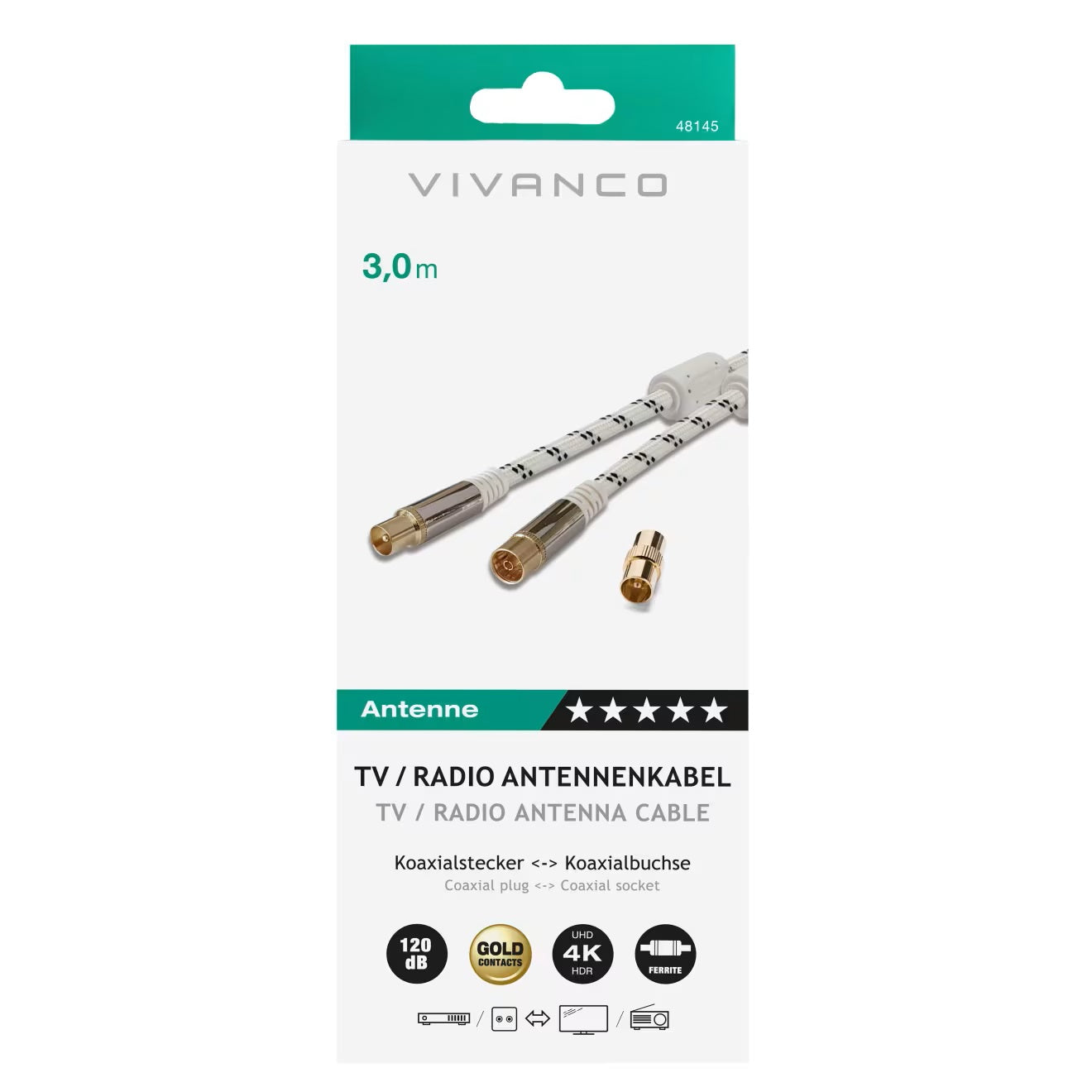 Sichern Sie sich eine störungsfreie Bild- und Tonqualität mit dem hochwertigen HQ Antennenkabel von VIVANCO.
