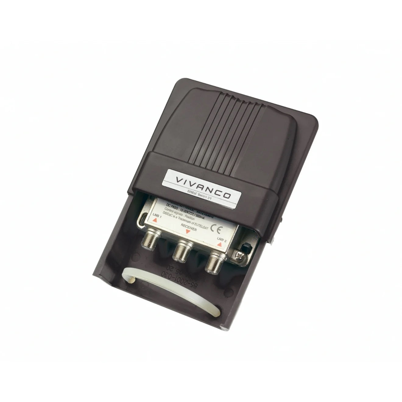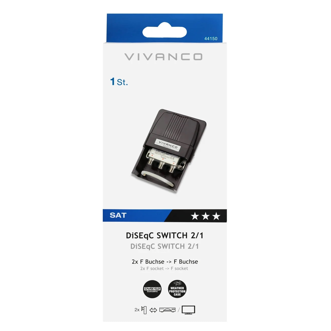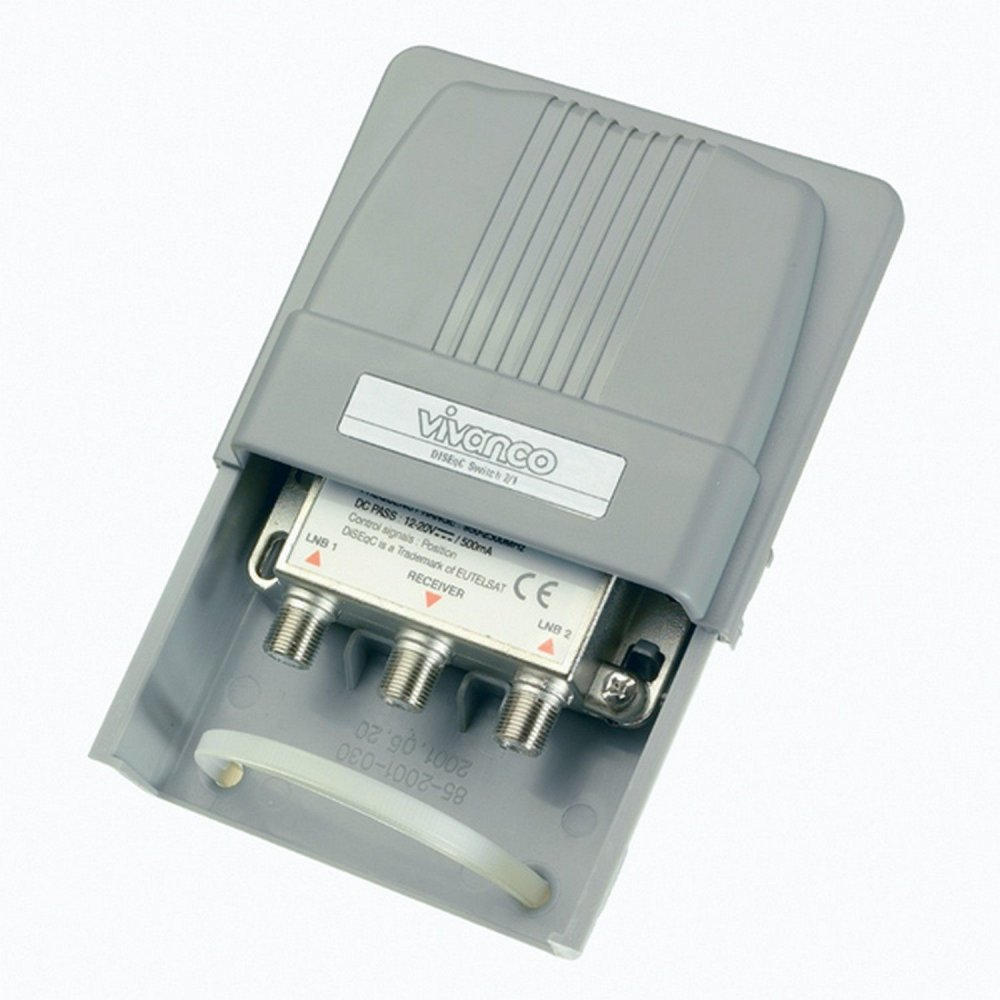 VIVANCO Hochwertiger DiSEqC Switch, kompatibel mit 2 LNBs, Umschalter 2 zu 1, F Buchse auf F Buchse, mit Wetterschutzgehäuse, 2500 MHz